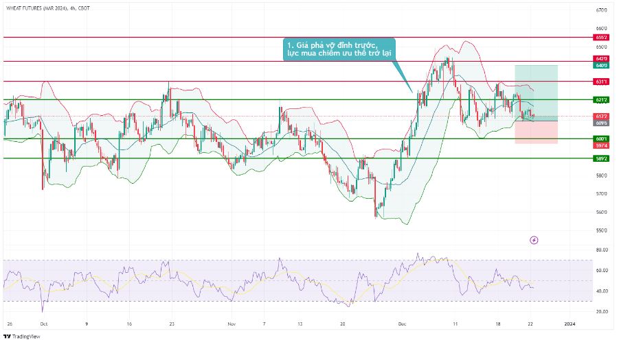 Giá lúa mì hiện đã chạm vùng entry 612 của vị thế Long mà chúng tôi đã khuyến nghị trong phiên hôm qua. Nhà đầu tư có thể tiếp tục duy trì vị thế này, với kỳ vọng giá có thể hướng lên vùng 630 – 640 và SL khi giá giảm xuống dưới vùng 600.