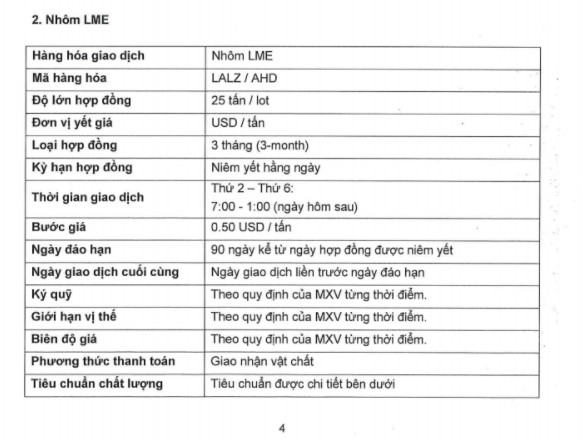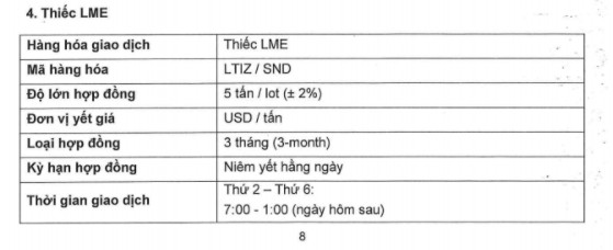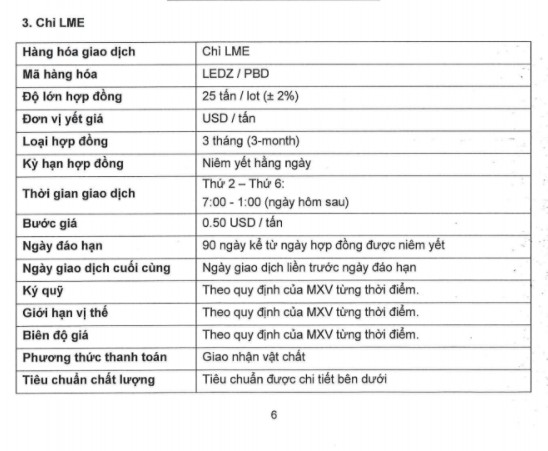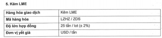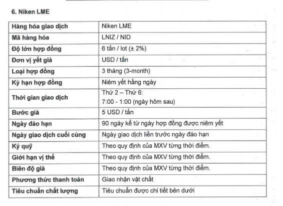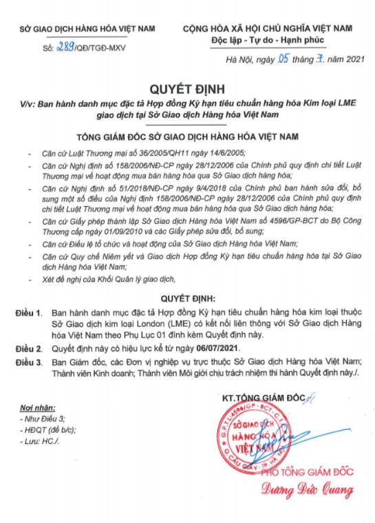 Theo quyết định số 289/QĐ/TGĐ-MXV từ Sở giao dịch hàng hóa Việt Nam (MXV), VMEX xin thông báo tới nhà đầu tư danh mục đặc tả Hợp đồng Kỳ hạn tiêu chuẩn Hàng hóa kim loại thuộc sở giao dịch kim loại London ( LME ) có kết nối liên thông với Sở giao dịch hàng hóa Việt Nam ( MXV ) từ ngày 06/07/2021 .