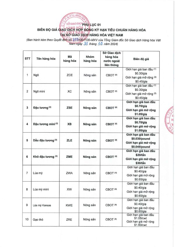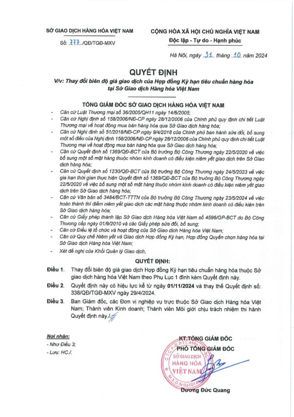 Theo quyết định số777 QĐ/TGĐ-MXV từ Sở giao dịch hàng hóa Việt Nam (MXV), VMEX xin thông báo tới nhà đầu tư về việc thay đổi biên độ giao dịch của HĐ KHTC. Thời gian áp dụng kể từ ngày 01/11/2024.