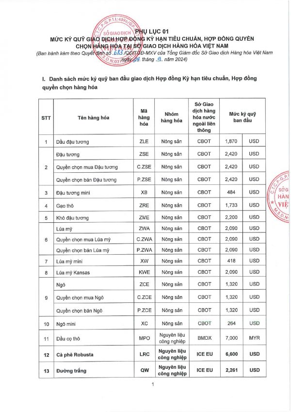 Công ty cổ phần giao dịch hàng hoá VMEX gởi tới quý khách hàng, mức ký quỹ giao dịch hàng hóa tại MXV do Sở giao dịch hàng hoá Việt Nam ban hành, áp dụng từ phiên giao dịch ngày 25/09/2024