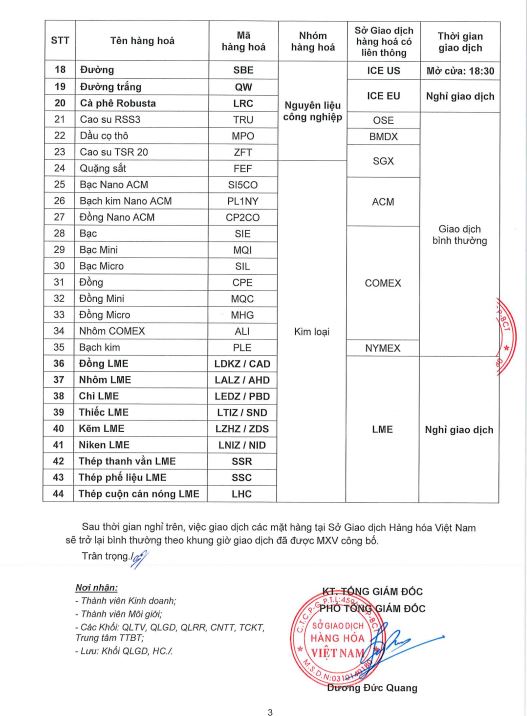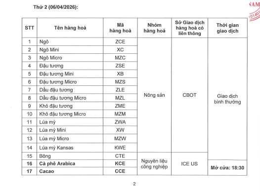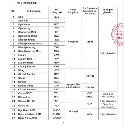 Căn cứ Lịch nghỉ giao dịch ngày 03&06/04/2026 các sản phẩm thuộc các Sở giao dịch hàng hóa nước có liên thông với MXV, VMEX xin thông báo: