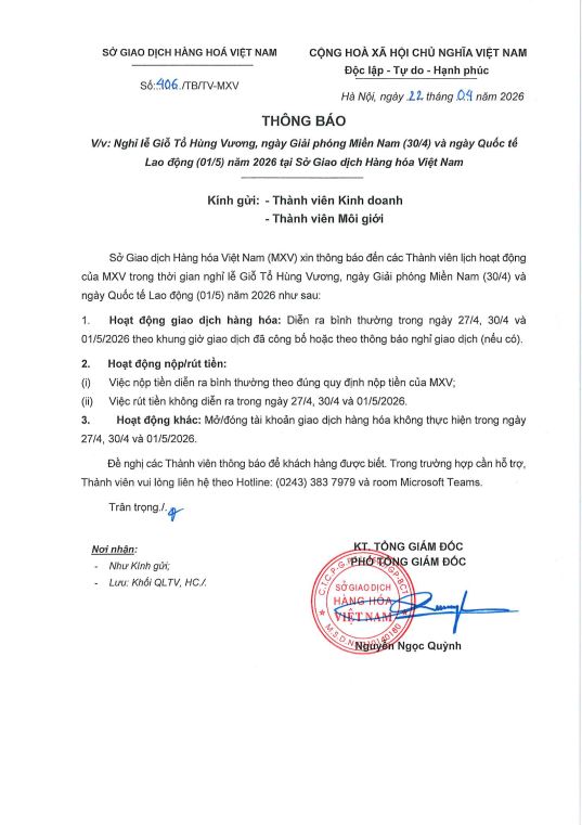 Lịch nghỉ lễ tại Công ty CP Giao dịch Hàng hóa VMEX và Sở Giao dịch Hàng hóa Việt Nam, thực hiện trong thời gian như sau: