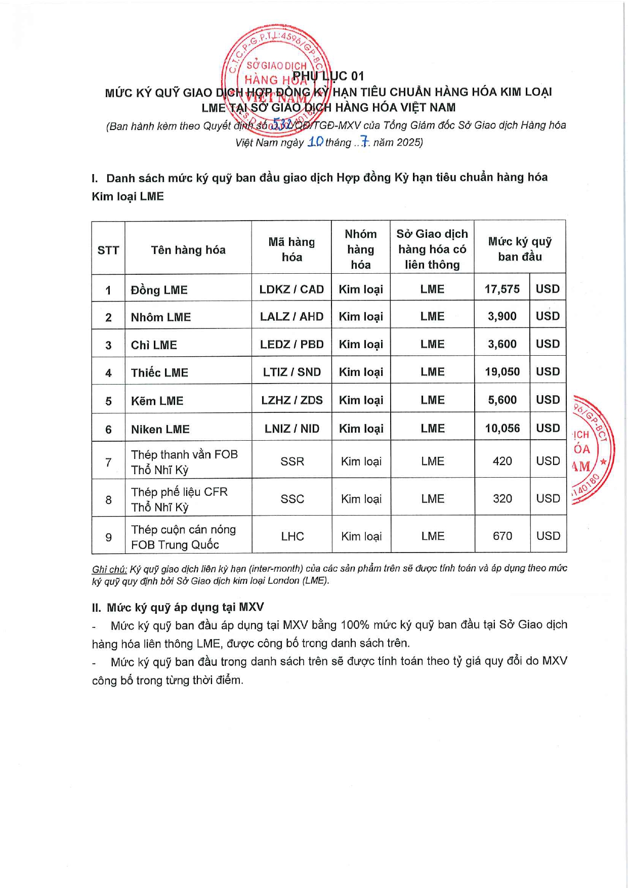 Theo quyết định số 532/QĐ/TGĐ-MXV từ Sở giao dịch hàng hóa Việt Nam (MXV), VMEX xin thông báo tới nhà đầu tư về việc thay đổi mức ký quỹ của một số sản phẩm. Thời gian áp dụng kể từ ngày 11/07/2025.