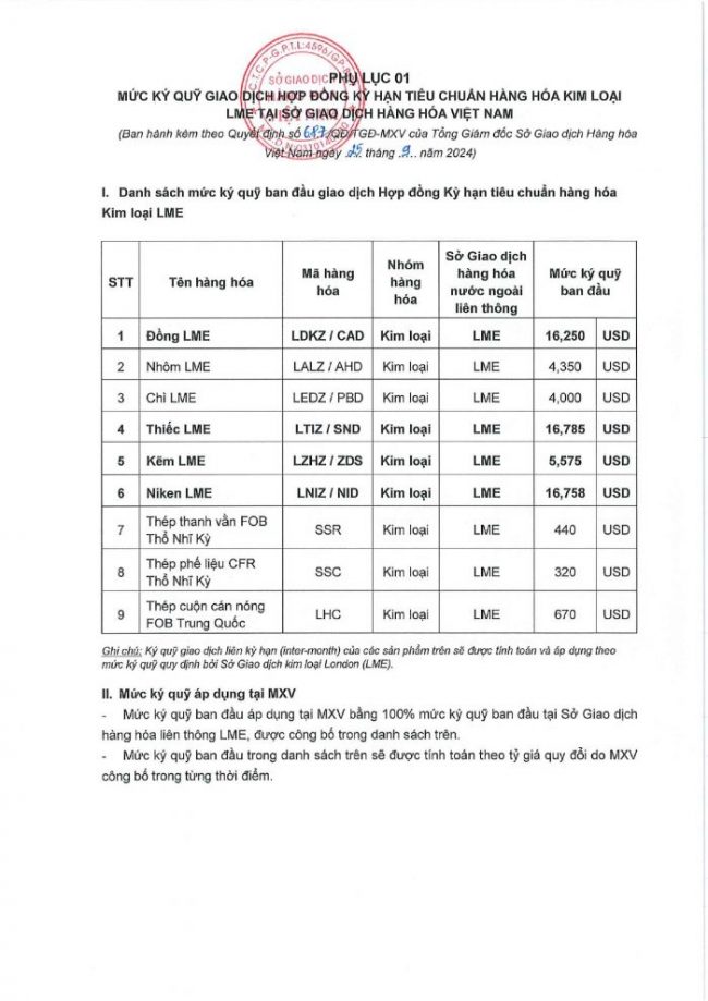 Theo quyết định số 687/QĐ/TGĐ-MXV từ Sở giao dịch hàng hóa Việt Nam (MXV), VMEX xin thông báo tới nhà đầu tư về việc thay đổi mức ký quỹ của một số sản phẩm. Thời gian áp dụng kể từ ngày 26/09/2024.